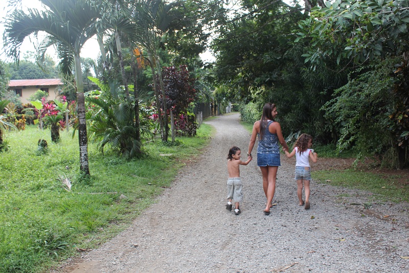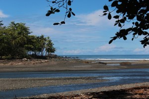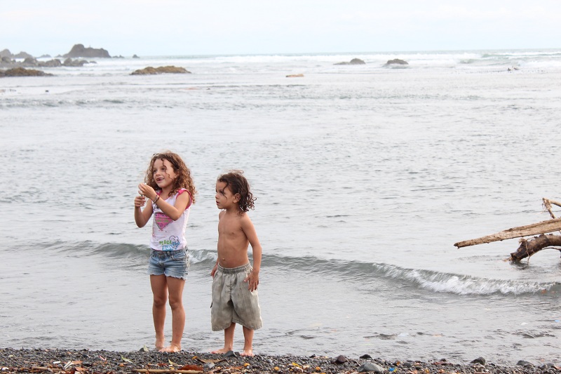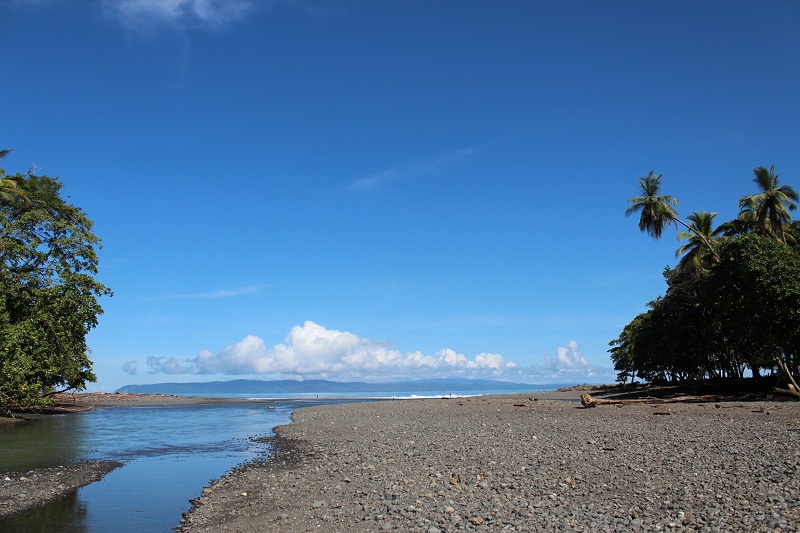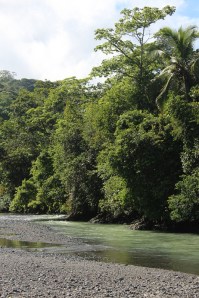 Gostaríamos de dizer que este lugar é mágico e espetacular. Somos acordados todas as manhas ao som de belos casais de araras vermelhas com penas azuis e amarelas, que conversam entre eles e nos desejam um bom dia. O barulho da mata virgem suave e úmido que ecoa em nossos ouvidos nos convidam a olhar pela janela e ver suas árvores com copas gigantes e raízes enormes sobre o chão. Caminhamos sempre pelas poucas ruas que se concentram no centro deste pequeno “Pueblo” e nos deixam levar até uma praça linda e arborizada, com pássaros multicoloridos e flores a perder de vista. Olhando para o mar que está à frente da praça, apenas separado por uma baixa mureta de concreto e muitos troncos de árvores que a maré trás em suas cheias, há um rio a esquerda de pedras vulcânicas e águas verdes, onde todos os dias nos refrescamos e recarregamos nossas energias. Este rio tem uma força em sua correnteza que quando a maré está secando forma sulcos de águas transparentes e correntezas deliciosas que nos convidam para uma descida com boia de caminhão até o encontro com o mar.