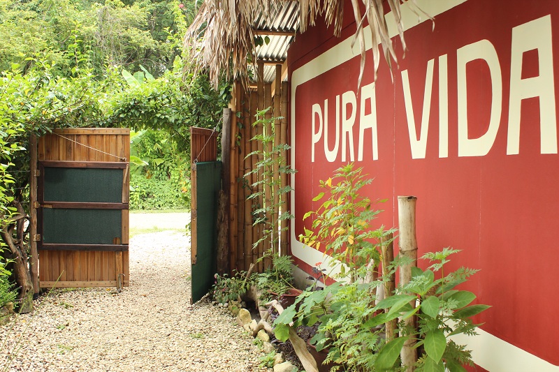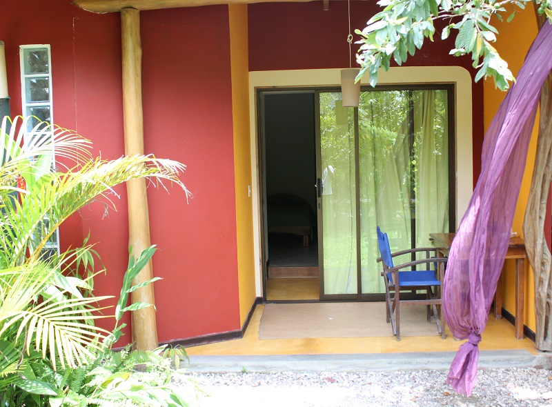 Estávamos em um hotel chamado Meli Melo, um pouco mais afastado do centro de Santa Teresa, distante 50 m da praia e perto de dois pequenos mercados bem estruturados. Logo na entrada do hotel fomos recebidos com uma frase gigante escrito “Pura Vida” na parede. Caminhando um pouco mais vimos belos quartos de cor vermelho bordô, com molduras brancas ao redor de suas janelas e portas. As áreas externas dos quartos eram decoradas com tecidos transparentes roxos (que voavam com a brisa!), pisos amarelo gema, cercas de bambu, e varandas privadas de frente para o jardim central extremamente florido.