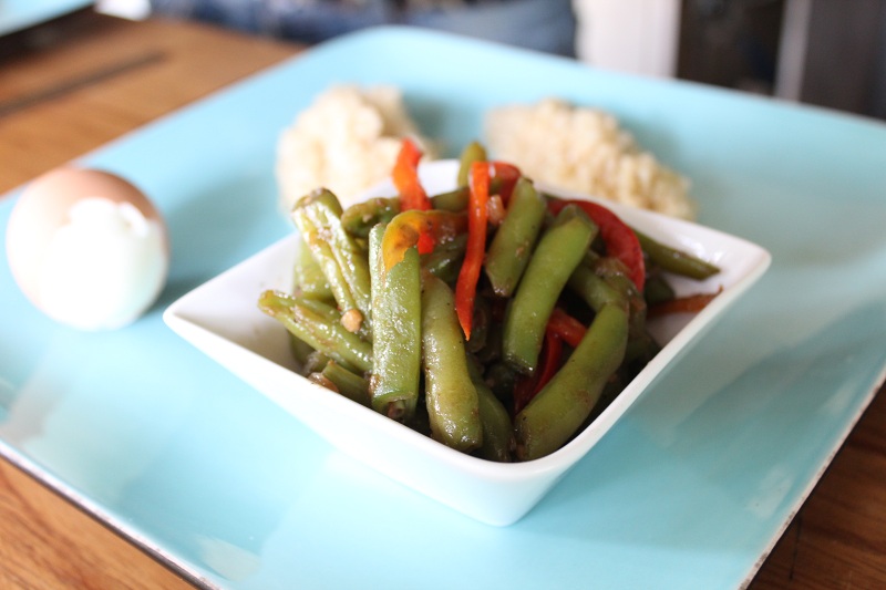 Criamos também outro prato que levou o nome de Doces Cebolas. Essa levou em sua receita cebolas brancas cortadas em tiras medianas, meio pimentão vermelho cortado em tiras finas, 500g de vagem já cozidas e cortadas, azeite de oliva extra virgem, manteiga, salsa china (molho Chinês) e duas porções de açúcar. Tudo levado na frigideira com fogo alto. Deixamos por alguns minutos e retiramos quando as cebolas estavam douradas e crocantes. Para acompanhar fizemos arroz integral e ovos cozidos.
