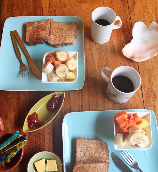 Ângela, a simpática cozinheira matinal, nos preparava um delicioso “desayuno” todas as manhãs, que era servido em louças brancas recheadas com frutas da estação, geralmente banana, mamão e abacaxi. Tudo muito bem cortado e misturado. As frutas acompanhavam dois pães integrais tostadinhos e quentinhos, servidos juntos com manteiga e geleia de goiaba. Sempre era servido o mesmo “desayuno”, mas acreditem ou não, dormia pensando na manhã seguinte no delicioso café da manhã. Acordava e já vinha à imagem dos pães quentinhos e a manteiga sendo passada e se derretendo nos farelos torrados.