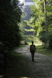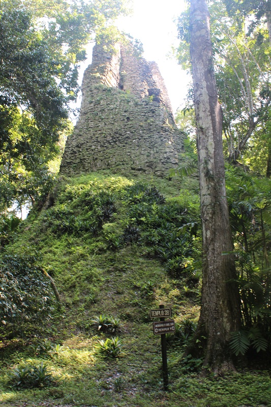 Continuando pela trilha avistamos alguns templos completamente encobertos de vegetação, com árvores centenárias por cima dos edifícios maias. Encontramos também montanhas com muitas árvores à primeira vista e quando se contornava a mesma, víamos surgir em sua outra metade templos imensos.