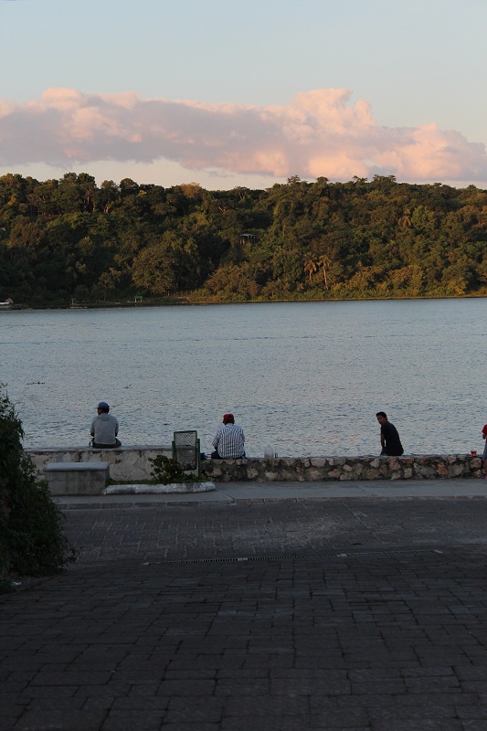 Chegamos e fomos direto fazer um almoço-janta. Decidimos comer no mesmo restaurante do dia anterior, porém, dessa vez pedimos duas macarronadas. Satisfeitos ficamos sentados conversando sobre os maias e revendo as fotos que tiramos ao longo do dia. Pagamos a conta, e como o restaurante estava bem próximo do lago aproveitamos para apreciar o final de tarde.