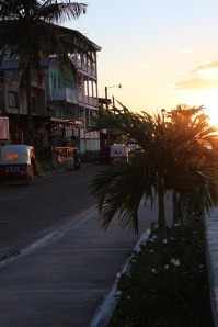 Acordamos por volta de 11h e saímos para conhecer a cidade, sacar dinheiro e encontrar um restaurante para almoçar. Fomos então para Santa Helena, cidade vizinha interligada a Flores por uma pequena ponte. Santa Helena é maior e é onde estão todos os bancos, supermercados e centros comerciais. Aproveitamos para ir caminhando, pois assim poderíamos conhecer melhor Flores (que por sinal é muito pequena) e também um pouco de Santa Helena. Para se ter uma ideia do tamanho de Flores, é possível dar uma volta completa na ilha apenas caminhando por alguns minutos. Bom! Caminhamos então até Santa Helena, sacamos dinheiro e fomos almoçar. Paramos em um restaurante local e tradicional que era indicado em nosso livro de mochileiro, o Lonely Planet.