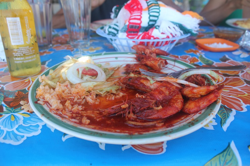 Voltamos para nossas cabanas maravilhados. Comemoramos mais uma vez no restaurante na beira da praia, pedimos camarões e peixes fresquinhos para comer, tudo acompanhado de quatro Coronas (cerveja local) para brindar (até o Ro bebeu!).
