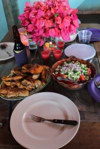 No outro dia fomos ao encontro de Jimmy e Bianca para almoçarmos juntos. Chegamos de manhã e a Bianca já havia preparado o almoço de Natal. Arrumamos a mesa, preparamos uma salada e o Ro vez um ceviche de peixe. Tudo estava muito gostoso e decorados com lindas flores colhidas do jardim. Para nosso almoço de Natal tivemos: frango, maionese com batatas, cenoura e milho, arroz com cenoura, salada de pepino e tomate, e claro algumas coronas!