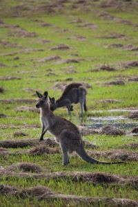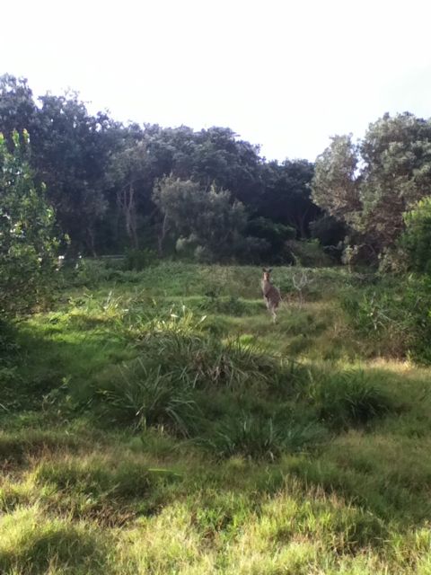 Teve um dia voltando na trilha que estávamos conversando a respeito das ondas, quando o Ro disse: – Pri olha um canguru! Fiquei sem reação, pois estava desejando há muito tempo um encontro. Ficamos uns 5m de distância dele, o canguru ficou ali parado, mastigando um matinho e nos observando. Ele era lindo, parecia um coelho gigante, seu pelo era cinza e parecia ser muito macio, suas patinhas dianteiras eram pequenas, as traseiras bem maiores e sua calda era grande e forte. Nossa curiosidade e ânsia de chegar mais perto, espantou o bichinho que saiu pulando muito rápido. Ficamos muito contentes de ter visto nosso primeiro canguru!