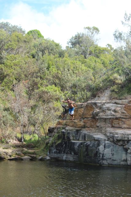 Em Yamba, acordávamos cedo e íamos direto para a praia de Angourie checar o mar e ver as condições das ondas. A praia de Angourie é uma reserva ecológica, muito bem cuidada e sinalizada. Aqui se pode fazer trilhas em meio à mata e admirar os inúmeros pássaros, pequenos animais e se tiver sorte até encontrar cangurus! Há também dois outros passeios para se fazer e conhecer a Blue lagoon e Green lagoon, que são duas lagoas de água doce, em frente ao mar, as duas tem paredões rochosos bem altos e vegetação aquática. O Ro experimentou as duas lagoas até saltou do paredão da Blue, mas eu medrosa, só entrei na Blue e ainda com muito medo, pois a água era turva e não dava para ver os pés em uma quantidade pequena de água. Valeu a experiência do banho e claro as belas fotos tiradas!