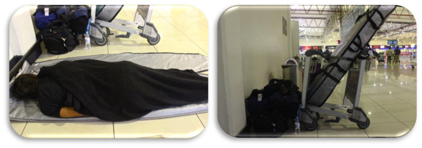 Resolvemos então passar a noite no aeroporto, que por sinal estava lotado de pessoas na mesma situação que a nossa. Não encontramos nenhuma cadeira, decidimos então dormir no chão mesmo. Organizamos nossas coisas, concentramos tudo em um carrinho e amarramos bem para ninguém levar nada. Para ficar um pouco mais confortável, pegamos umas capinhas de prancha que o Ro tinha para fazer as divisões das pranchas dele e colocamos no chão. Deitamos e cochilamos um pouco, fazia muito frio no aeroporto, com isso não consegui relaxar, mais o Ro dormiu gostoso…(veja a foto dele abaixo, ele até roncou)