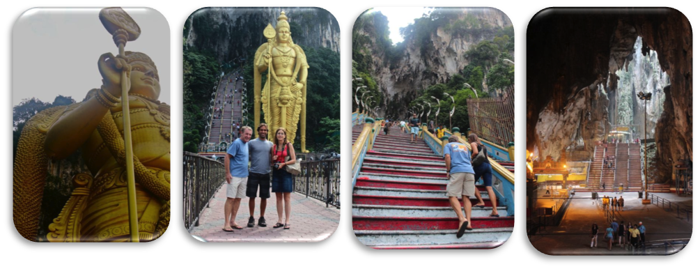 Richard e Debby nos levaram para fazer um City Tour por Kuala Lumpur, passeando por alguns pontos turísticos da cidade. O primeiro foi o Batu Cave, uma caverna que fica a uns 30min de carro do centro de Kuala Lumpur. Logo na chegada avistamos a imensa estátua de um Deus Hindu, depois subimos uma imensidão de degraus e chegamos à caverna, situada no meio de uma montanha bem alta. Dentro da caverna há alguns templos Hindus, estes coloridos, cheios de estátuas e motivos religiosos. O que deixa a caverna toda especial é uma pequena abertura no topo, que permite alguns raios de luz entrar e deixar uma iluminação pontual. Há também muitos macacos sapecas e atrevidos.