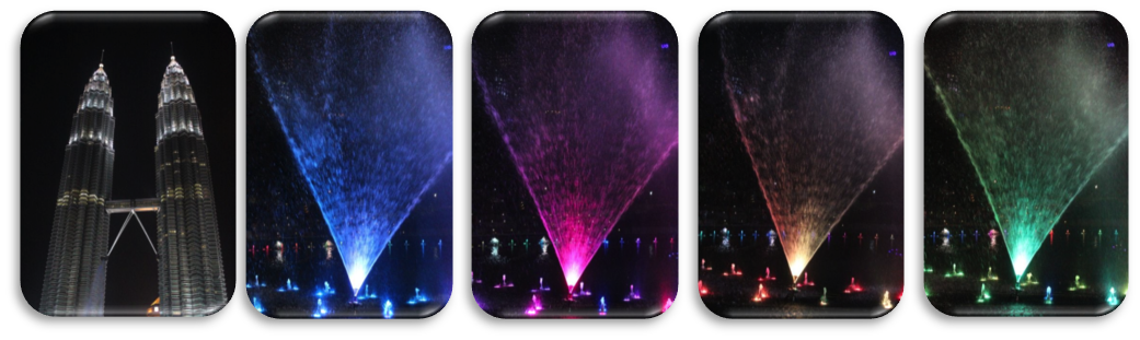 Na saída das torres você dá de cara com um show de águas dançantes, onde muitos turistas se concentram para fotografar e para apreciar, pois é muito bonito. Essas águas à noite mostram todo seu charme com efeitos de iluminação aquática colorida. Fantástico!