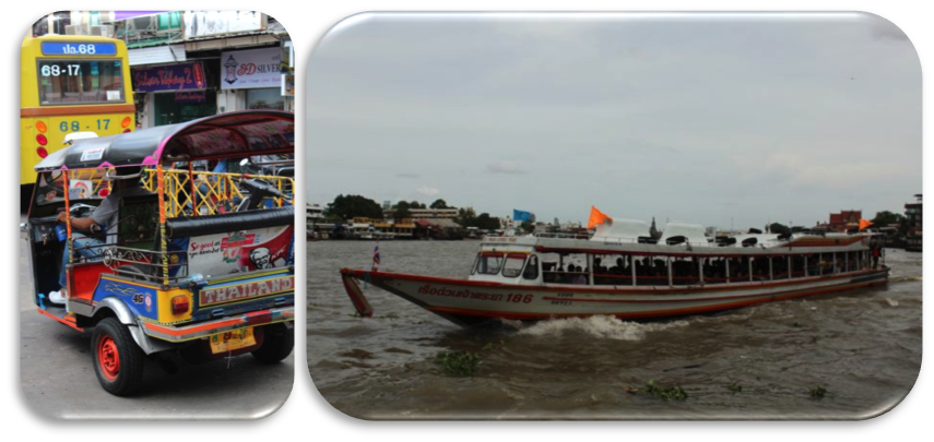 Bangkok é uma cidade extraordinária e fácil de se transitar. Aqui existem todos os meios de transportes possíveis que uma metrópole deveriam ter, como: carro, ônibus, trem, moto, tuk tuk e barco. Utilizávamos muito o transporte pela água, Bangkok é cercado de rios e toda população utiliza-o, pois é rápido, barato, seguro e de primeira. O melhor ainda é que não se pega trânsito, vai curtindo a paisagem e não ve a hora passar.