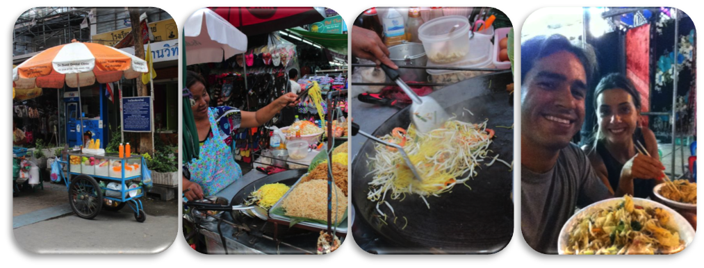 Aqui comer fora é uma obrigação maravilhosa e uma combinação de coisas estranhas, cheirosas, interessantes, diferentes, picantes, saborosas e outras não tão agradáveis ao visual e também ao paladar. Vale muito a experiência! Um prato que sempre comíamos era o tradicional Pad Thai, uma mistura de macarrão de arroz, verduras, ovos e camarão (ou pode ser de frango também), frito na hora com molhos de ostra e shoyu. Uma explosão de sabores em sua boca. Outra coisa que comíamos e está por todos os cantos são as frutas, também vendidas em carrinho e cortada na hora em grandes pedaços suculentos e doces, por um preço muito baixo. Além desses pode-se comer de tudo na rua como sopas da mais variadas possíveis, frituras, insetos, e tudo que você poder imaginar.