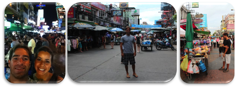 Em nossas primeiras noites ficamos hospedados em um hotel localizado atrás da famosa rua Khao San Road, o destino de todos os mochileiros e viajantes em Bangkok. Essa rua é super movimentada, com muitos bares, restaurantes, casas de massagem, lojas de artesanato, pratas, agências de viagem, vendedores ambulantes, taxistas, motos, bicicletas e muitos turistas. Além do mais é muito badalada à noite com músicas altíssimas até altas horas da madrugada. Bom! Já deu para imaginar a loucura!