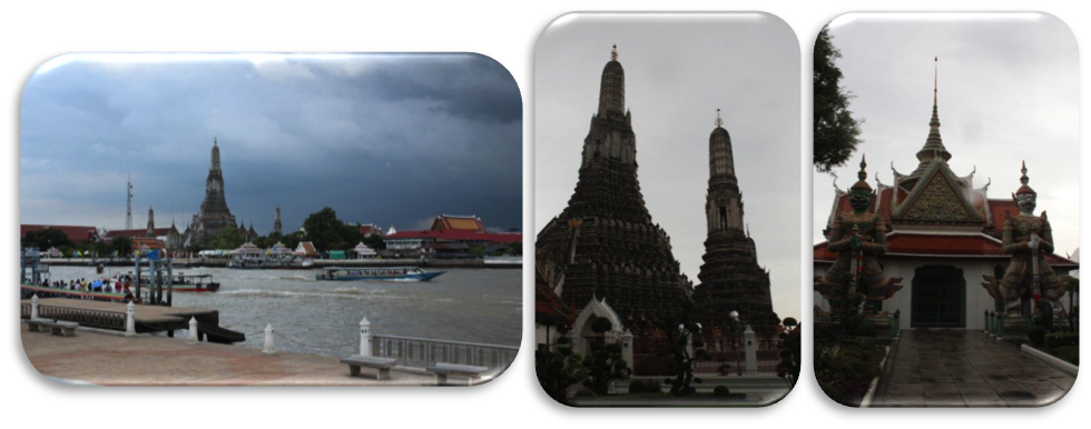Em Bangkok visitamos muitos, mais muitos templos Budistas. O primeiro foi o Templo do Dawn (Wat Arun) um dos cartões postais da cidade. Neste templo é permitido subir e admirar toda a cidade do alto, porém, quando visitamos caiu uma chuva muito forte e o templo foi interditado para subir e fotografar. O que não estragou em nada nosso passeio, acredito que a chuva até deixou o templo com um charme a mais.