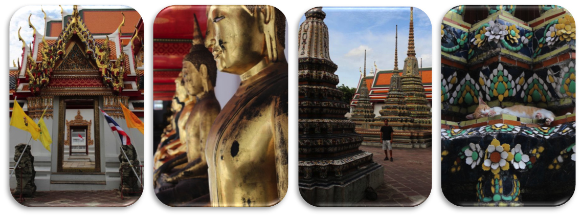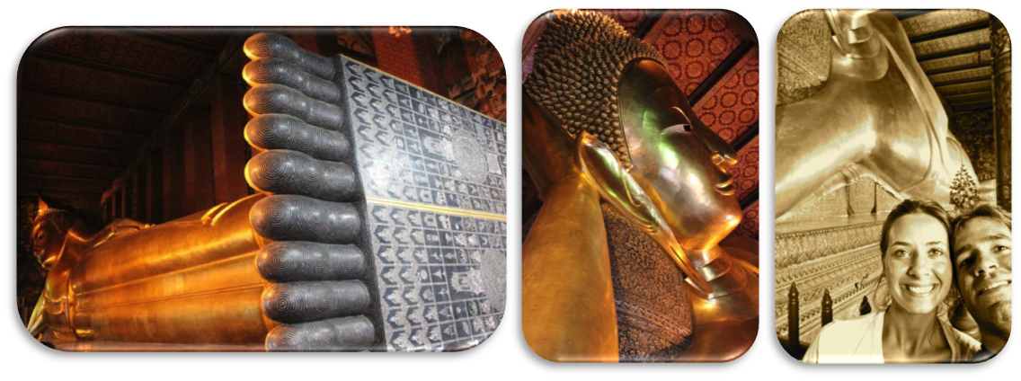 Outro templo foi o do “Buda Deitado” (Wat Pho), que está atrás do Gran Palace. Este é o mais antigo templo de Bangkok, que além de muitos Budas espalhados pelas construções, há um em especial que da nome ao templo, o Buda Deitado. Esse está em uma de suas posturas tradicionais, com uma das mãos apoiando a cabeça e a outra ao longo do corpo. São mais de 200m de comprimento e banhado em tinta dourada. O tamanho e perfeição nos detalhes é impactante, muitos turistas e devotos visitam o regularmente. É magnífico e de arrepiar! Tenha paciência para tirar uma bela foto, pois a multidào é grande!