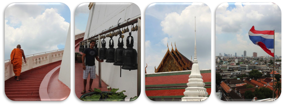 Mais um templo foi o do “Buda de Ouro” (Wat Traimit). Para ve-lo subimos uma escada em forma de caracol, passando por sinos prateados, dourados e até de bronze. Tocamos todos, dizem que dá sorte e tem que fazer pedido! Após longos sons de sinos e visuais bem marcantes da cidade, chegamos ao topo do templo. Logo na entrada já fomos recebidos por muitos Budas em diversas posturas, cores e materiais. No centro do templo, estava um Buda todo coberto com folhas e mais folhas de ouro. Muito bonito e majestoso. A vista que se tem da cidade é bem legal e o templo em si é bem interessante, vale a visita!