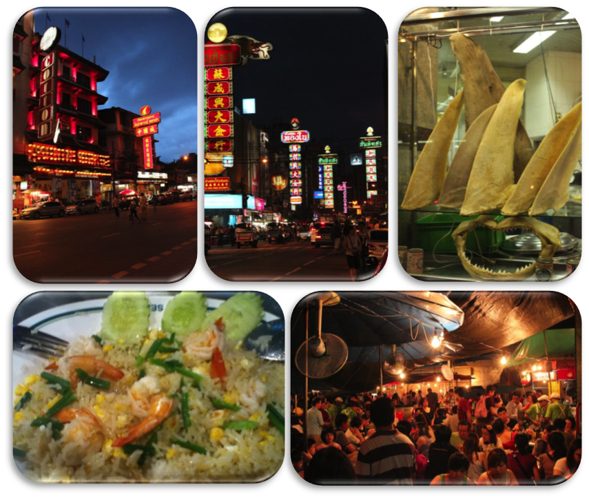 Como em todo país, sempre há um bairro destinado para os chineses e aqui em Bangkok não foi diferente. Chegamos no bairro no começo da noite e todos os letreiros e propagandas estavam escritas em chinês, tudo bem iluminado e colorido como manda a tradição. Passamos por alguns restaurantes e vimos um bem exótico servindo para seus clientes barbatanas de tubarão. (Nem os grandes animais marinhos são perdoados e sim caçados para servir a meros clientes que nem sabem o que se passa em alto mar!) www.causes.com/actions/1679274
